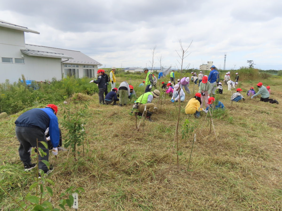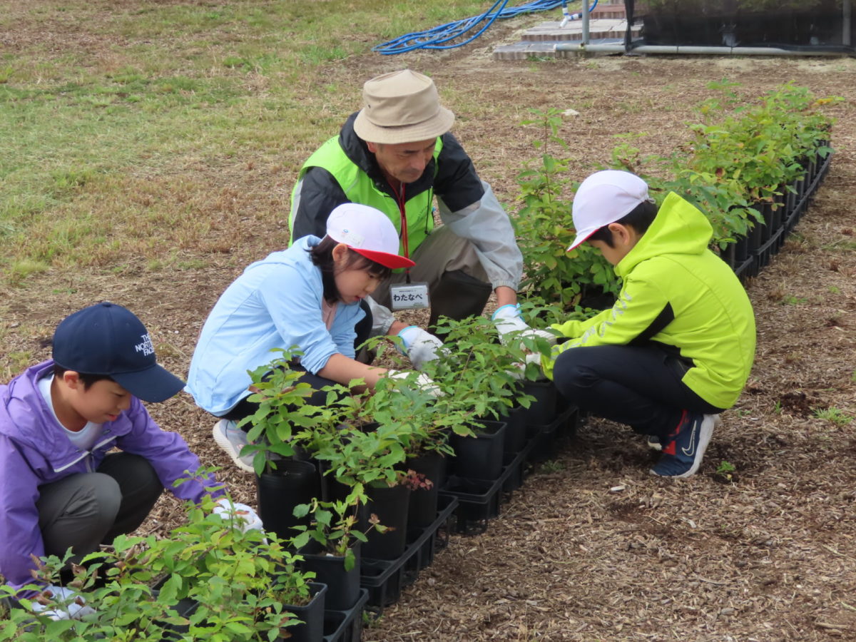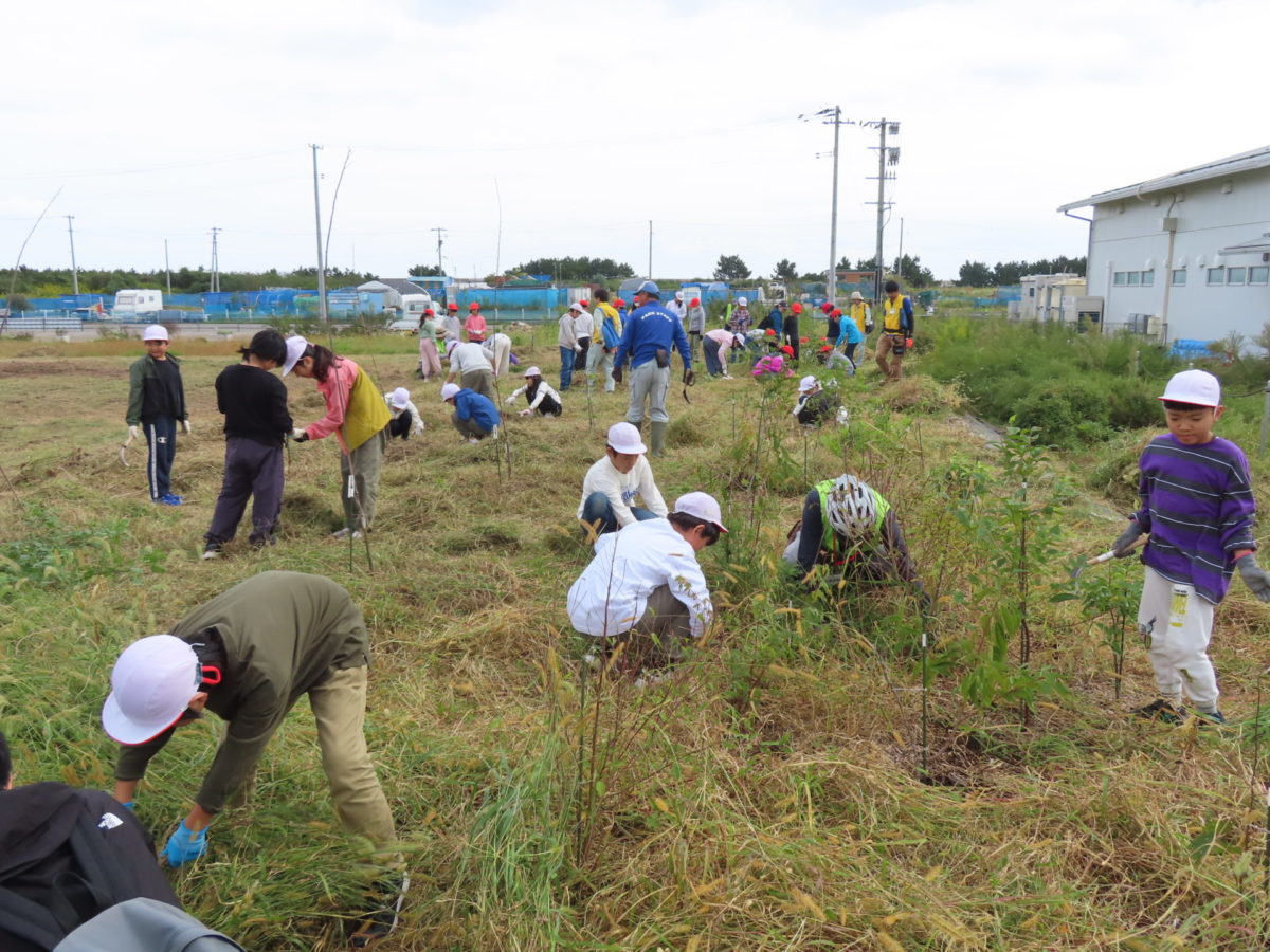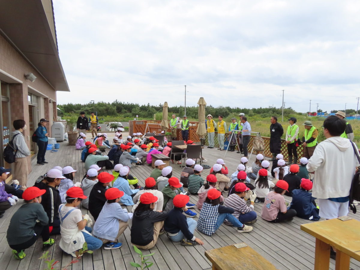 向山小学校から3年生46名と5年生41名の合わせて87人の児童が、震災遺構荒浜小学校を見学した後にふるさとの杜再生プロジェクトの荒浜圃場で育樹体験をしてくれました。それぞれの学年2クラスずつの4クラス全員とふるさとの杜再生プロジェクトメンバー、育樹サポーター、センターハウススタッフの方々とテラスで挨拶しました。
