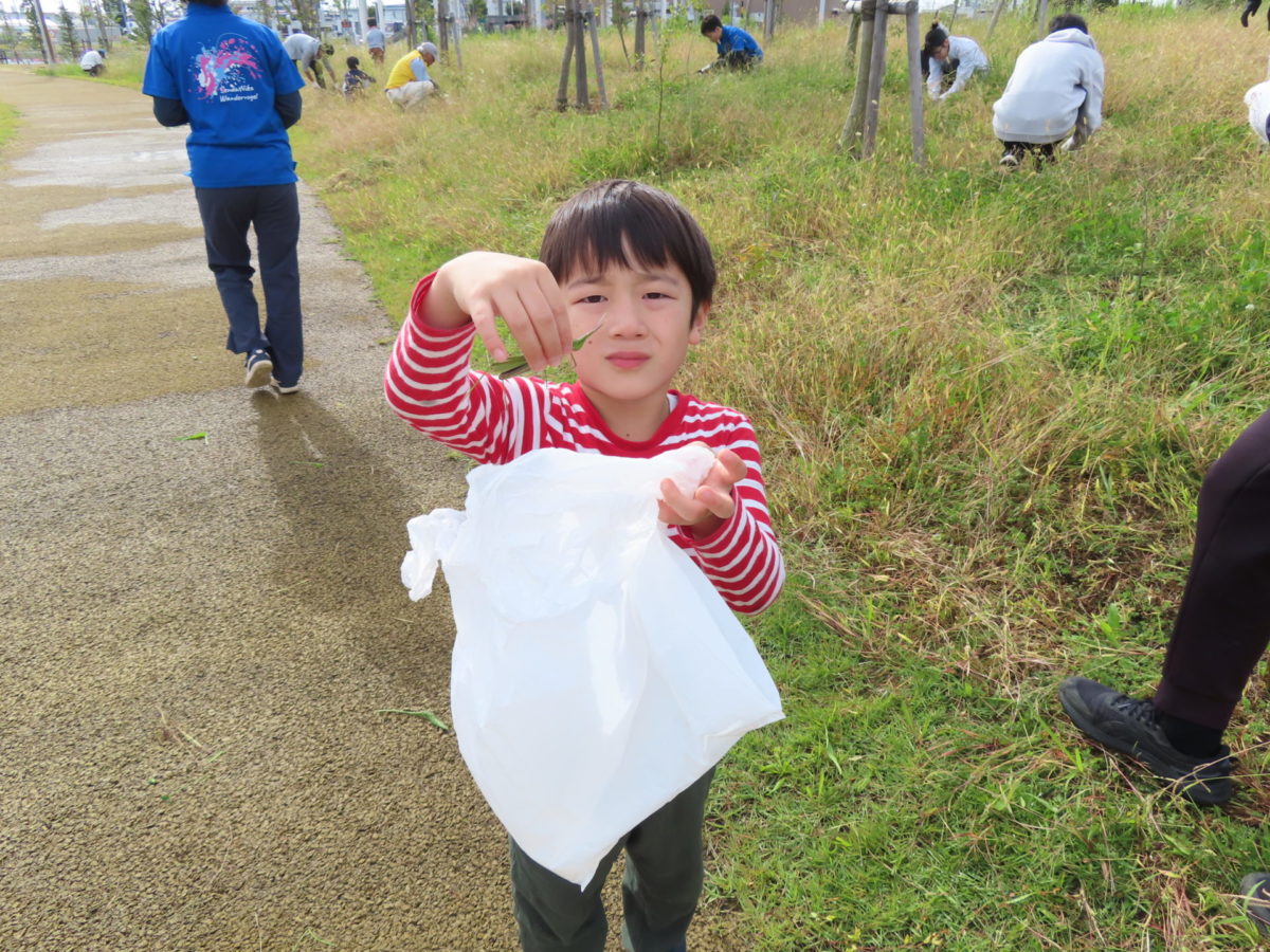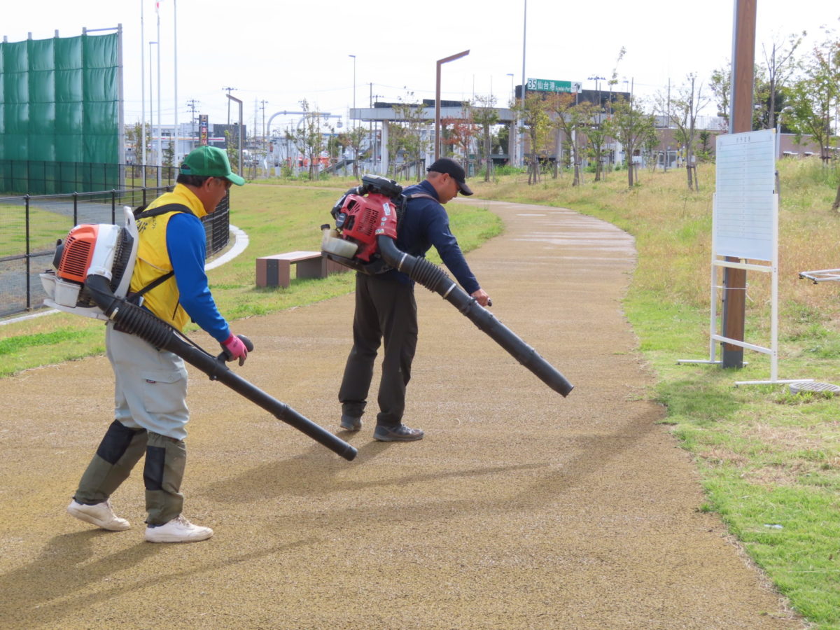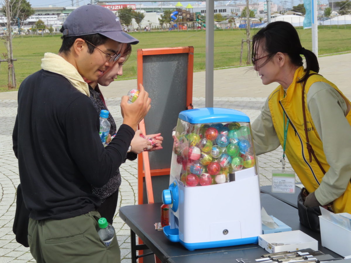 最後に歩道の落ち葉や草をブロアーで払って完了です。参加の方にはお土産にガチャガチャを回してもらいました。