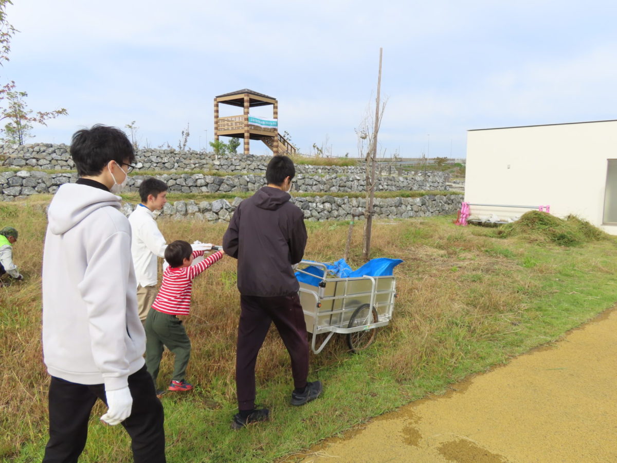 前回の育樹会に来てくれた親子がまたご参加いただきました。今日はアキアカネやショウリョウバッタを捕まえたり、もちろん集草・運搬も高校生と一緒に手伝ってくれたりと頑張りました!