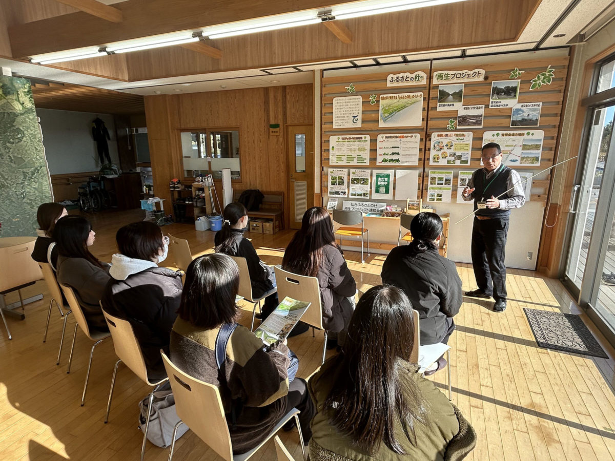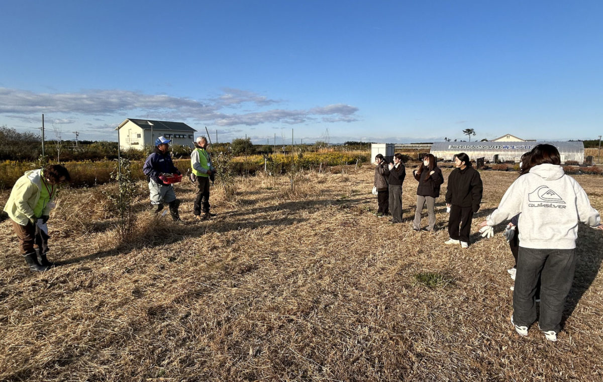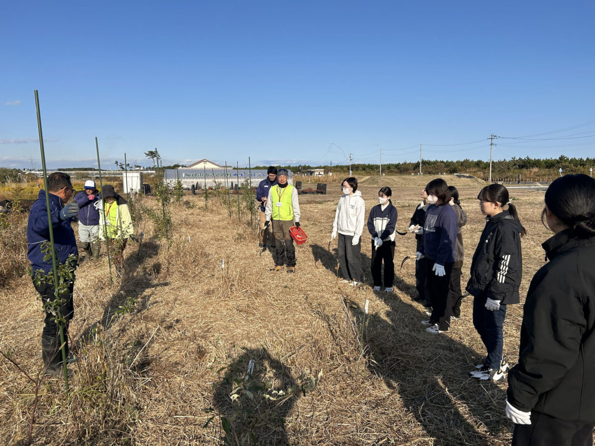 11月20日に宮城学院女子大学 生活文化デザイン学科 都市デザインゼミの学生8名が荒浜圃場の育樹活動を通じてふるさとの杜再生プロジェクトについて学びました。最初に、副会長の阿部所長からプロジェクトの概要とあわせて荒浜周辺の歴史から震災前後の地域の変化まで説明されました。