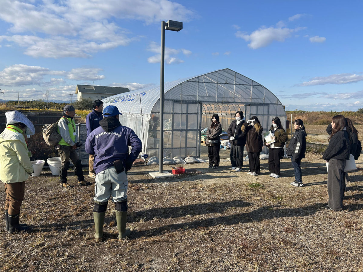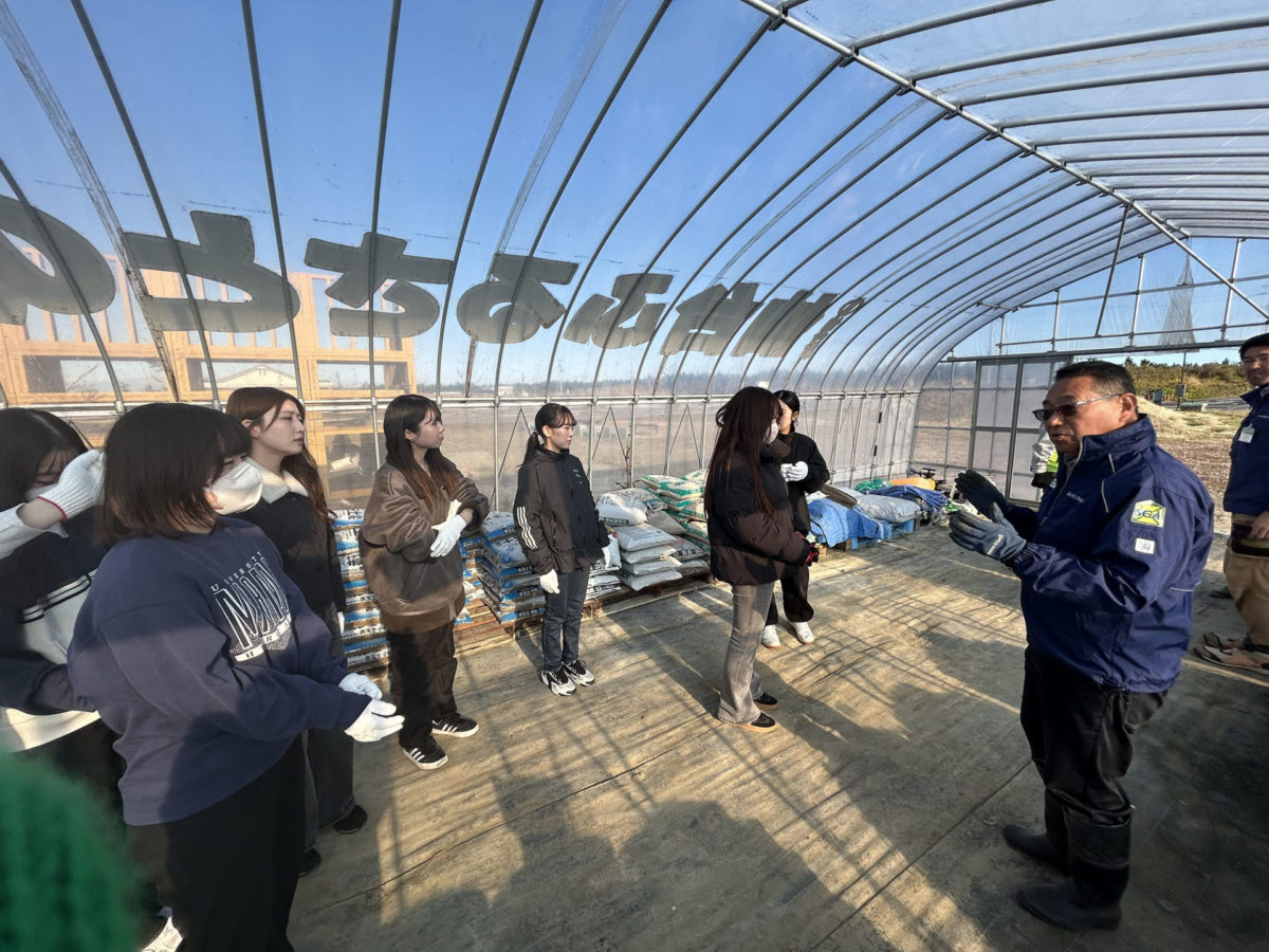 その後、荒浜圃場に移動し、ビニールハウスや資材が地元企業から寄付されたことや圃場で育てている苗についてお話しいただきました。