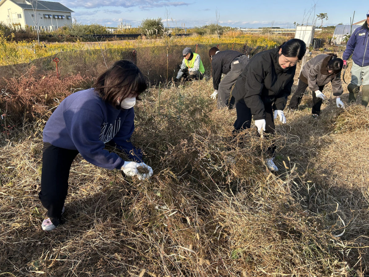 海岸林育樹サポーターの方が2人参加され一緒に除草しながら学生のサポートをされました。学生さんも慣れない鎌の扱いやひっつき虫と呼ばれる実の棘に難儀しながら頑張って作業されました。